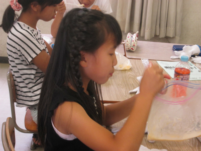 みんなで塩と氷を使って、アイスクリームの素を液体の状態からカチカチに冷やしました。