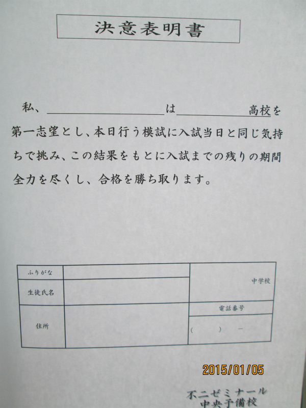 まずは模試の前に改めて志望校を確認し全員で決意表明書を記入。その後、入試と同じように国(+作文)数英理社の5教科で実施し、その日のうちに返却して志望校判定もしました。